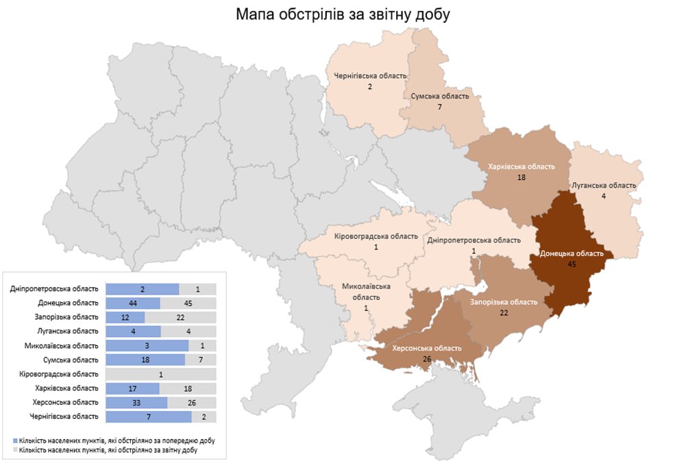 «Загалом з різних видів озброєння — міномети, артилерія, танки, РСЗВ, ЗРК, ОТРК, БПЛА та тактична авіація — були атаковані 127 населених пунктів та 115 об’єктів інфраструктури», — йдеться у повідомленні.