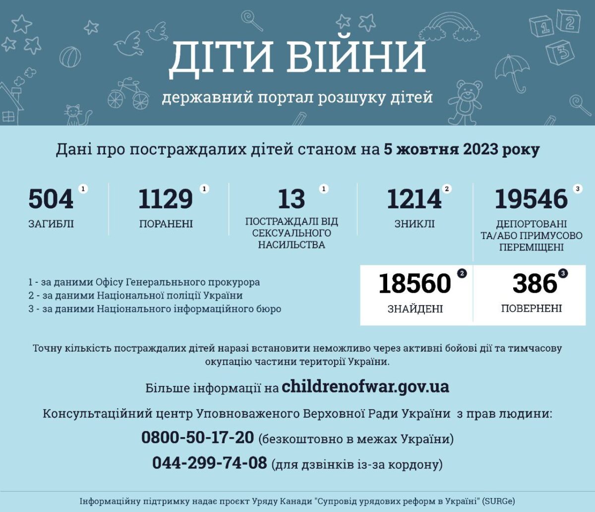 «За даними державного порталу розшуку дітей „Діти війни“, станом на 5 жовтня 2023 року (в Україні вважаються. — Ред.) зниклими — 1214 дітей, знайденими — 18 650 дітей», — поінформували у пресслужбі.