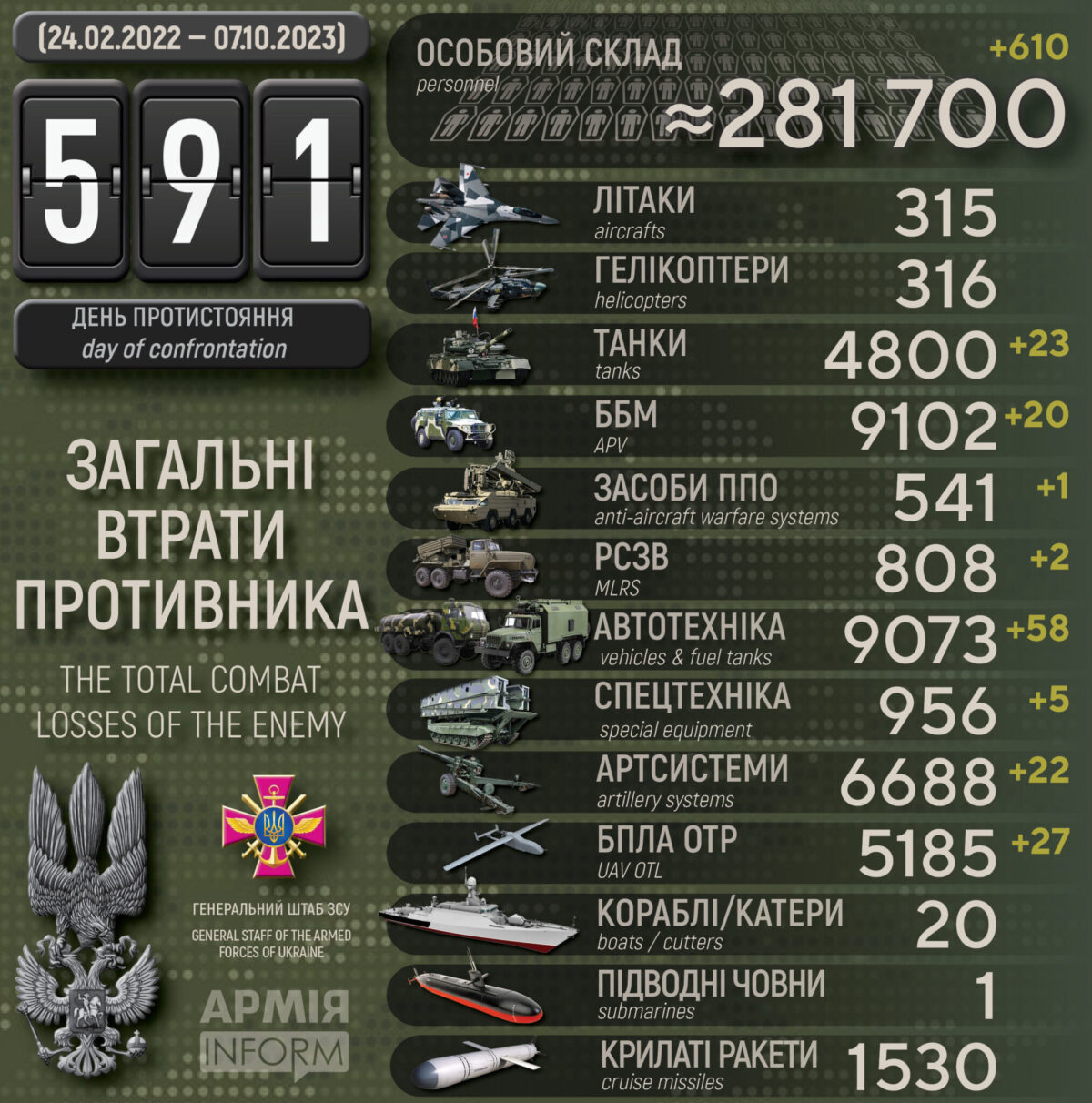 Загальні бойові втрати противника з 24.02.22 по 07.10.23 орієнтовно становлять: