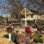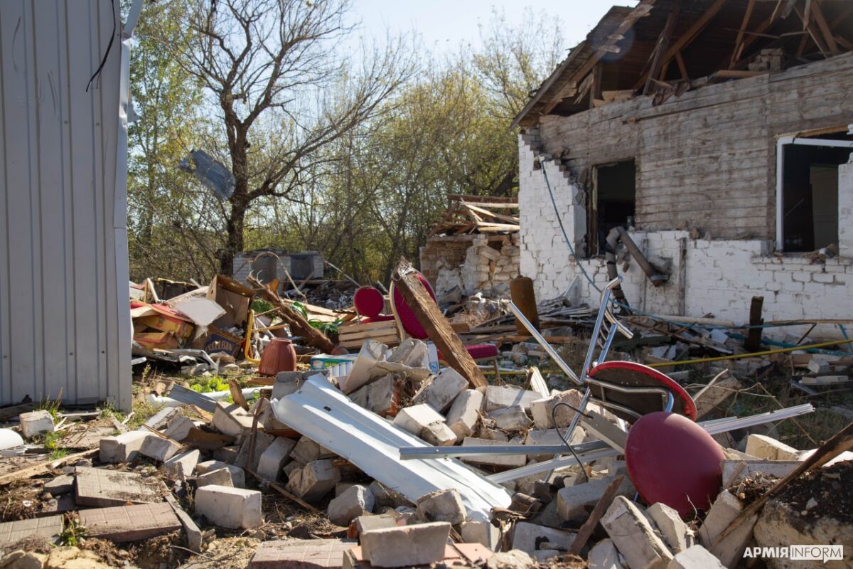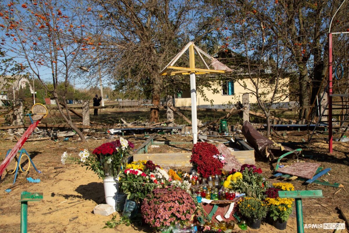Селище Гроза, що на Куп’янщині Харківської області, нагадує сьогодні цвинтар — порожнє, жодної живої душі на вулицях. На місці прильоту російського «Іскандеру» по місцевому магазину-кафе лежать сотні квітів та лампадок, дитячі іграшки. Навколо розкидані використані гумові рукавички, ноші, чорні пакети, до яких не дійшла черга, на які не вистачило сил, щоб прибрати… Гріє осіннє сонце, вдалині завиває сирена повітряної тривоги…