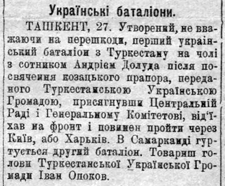 А замітка в газеті «Нова Рада» від 1 липня 1917 року повідомляє про утворення в Туркестані першого українського батальйону на чолі із сотником Андрієм Долудом, який присягнув Центральній Раді та Генеральному Секретаріатові та мав відбути на фронт, пройшовши через Київ або Харків.