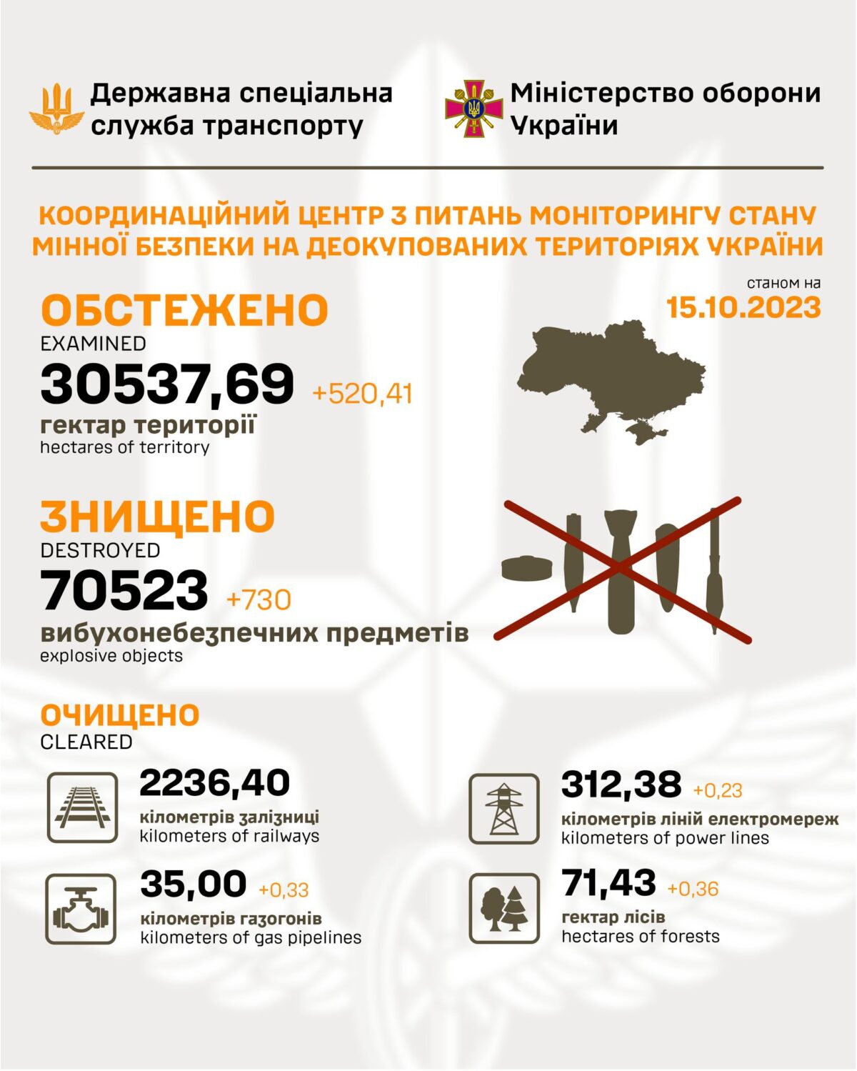 «Координаційний центр з питань моніторингу стану мінної безпеки на деокупованих територіях України інформує, що станом на 15.10.2023 саперні підрозділи Державної спеціальної служби транспорту обстежили 30537,69 (+520,41), знищили 70523 (+730) вибухонебезпечних предметів».