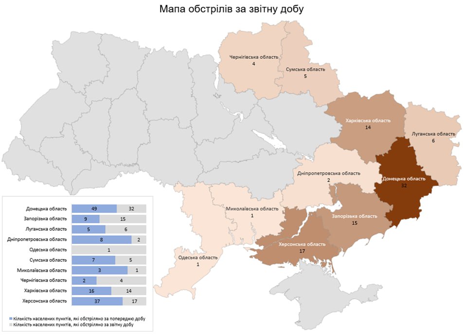 «Загалом з різних видів озброєння — міномети, танки, ствольна артилерія, РСЗВ, ЗРК, ОТРК, БПЛА та тактична авіація — були атаковані 97 населених пунктів та 31 об’єкт інфраструктури», — йдеться у повідомленні.