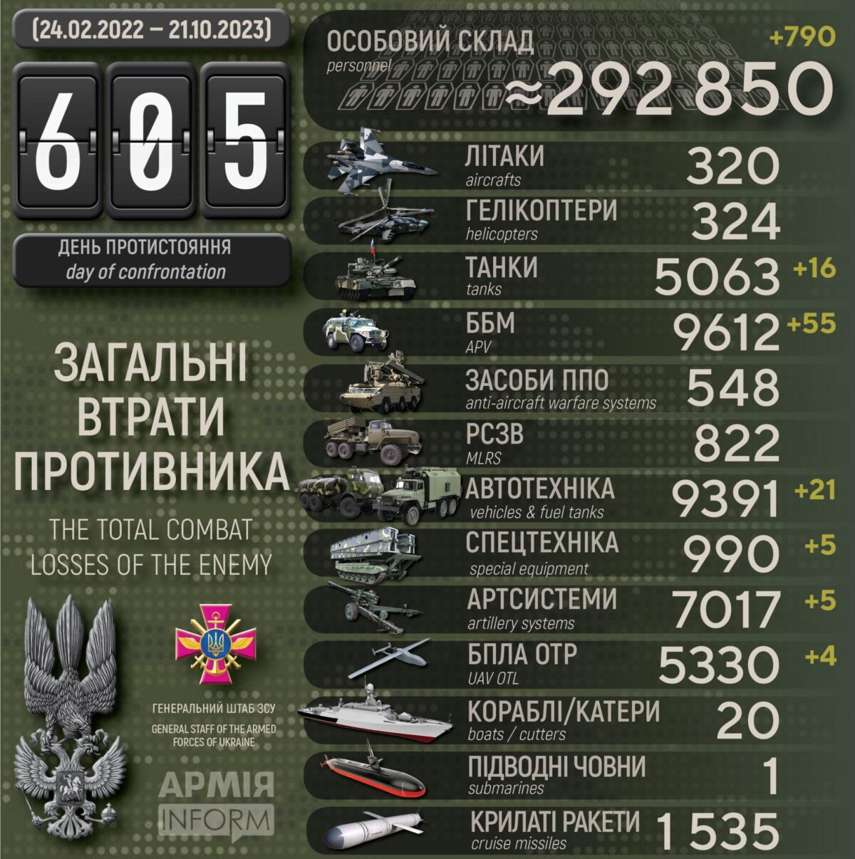 Загальні бойові втрати противника з 24.02.22 по 21.10.23 орієнтовно становлять: