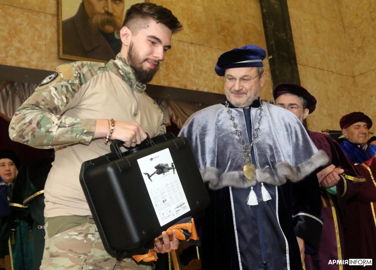 — Це була ідея, яку ми втілили в життя — зібрали кошти і придбали для розвідників 3-ї окремої штурмової бригади цей квадрокоптер, — каже ректор Львівського торговельно-економічного університету професор Петро Куцик під час зустрічі студентів і викладачів зі студентом-воїном. — Цей дрон допомагатиме захисникам бити агресора і ми вручаємо його нашому воїну, який відвезе його на передову після відпустки.