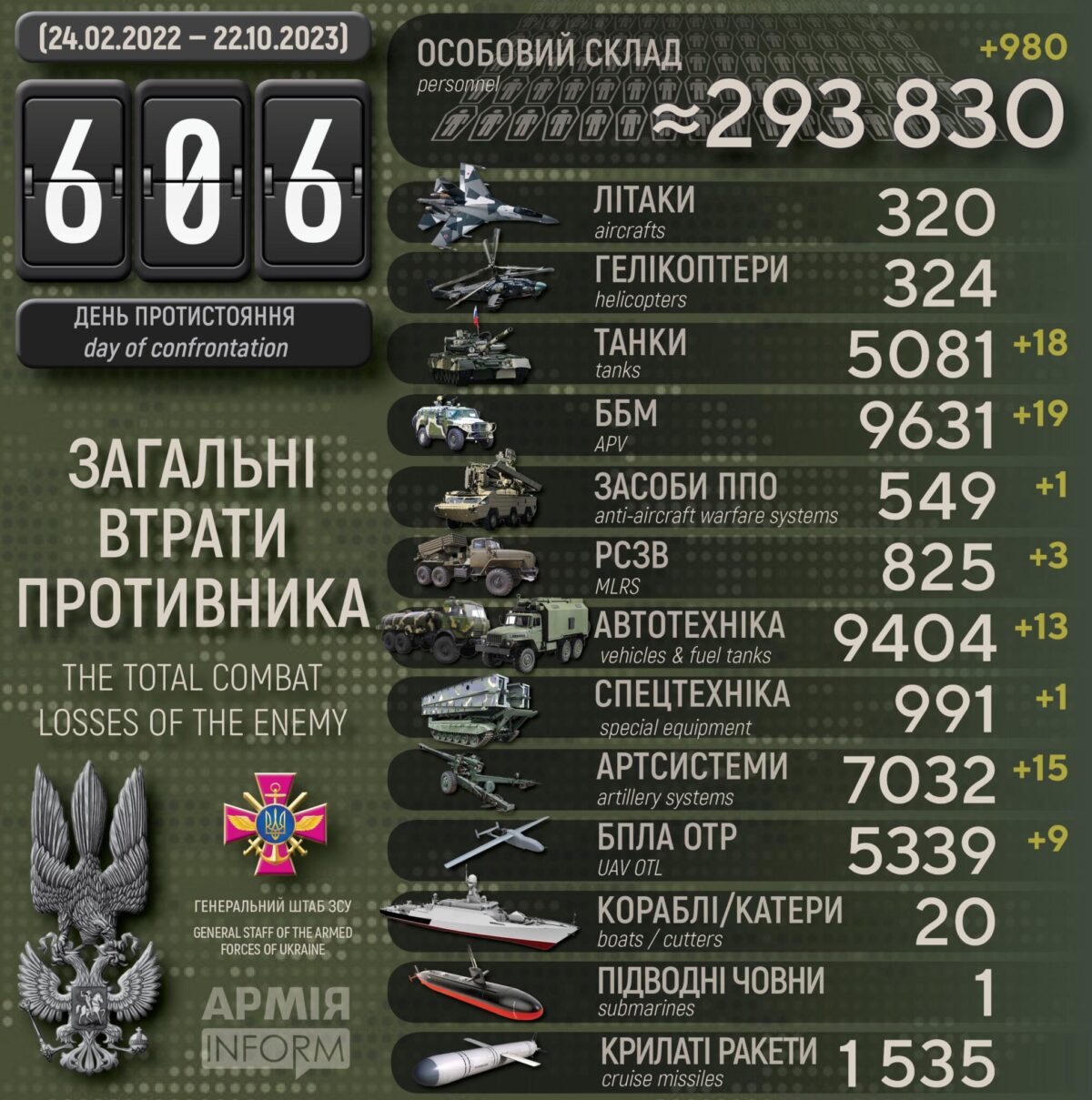 Загальні бойові втрати противника з 24.02.22 по 22.10.23 орієнтовно становлять:
