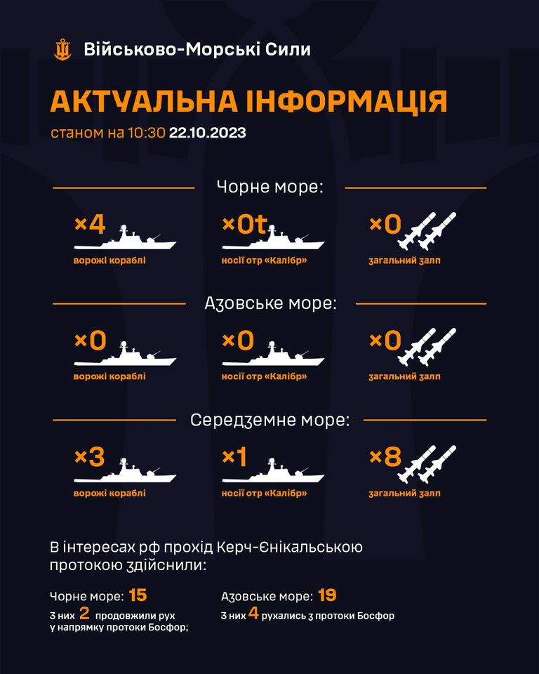 У Середземному морі на бойовому чергуванні перебуває три ворожі кораблі, серед них — один ракетоносій з вісьмома «Калібрами».