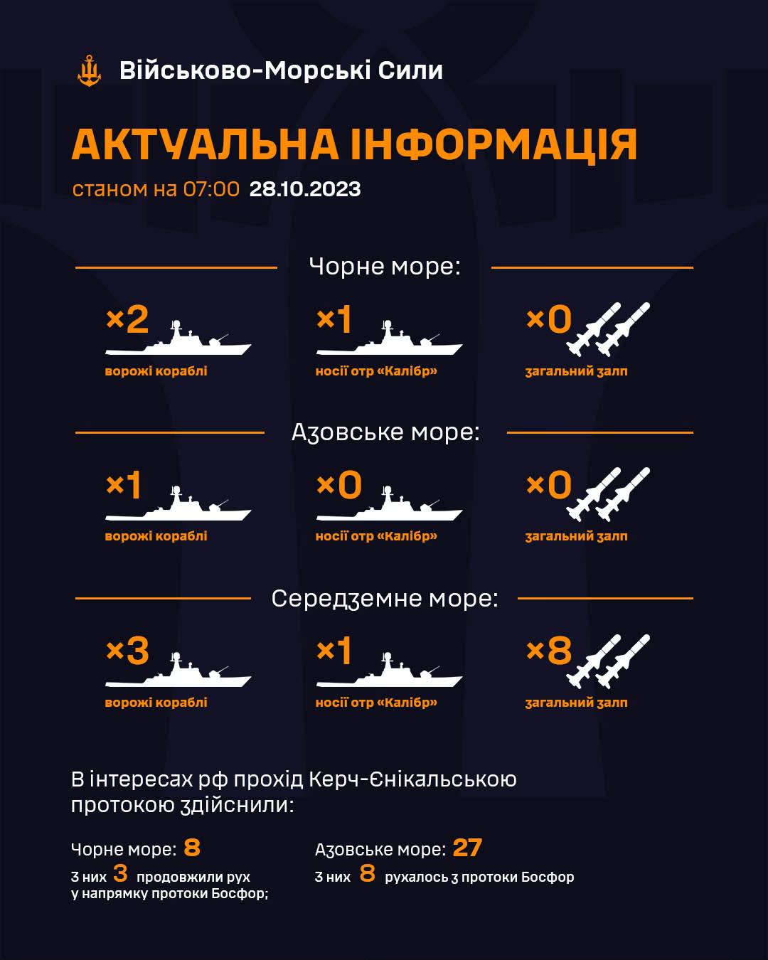 Станом на 07:00 суботи, 28 жовтня, росіяни тримають у Чорному морі на бойовому чергуванні два військові кораблі, серед яких один носій крилатих ракет «Калібр».