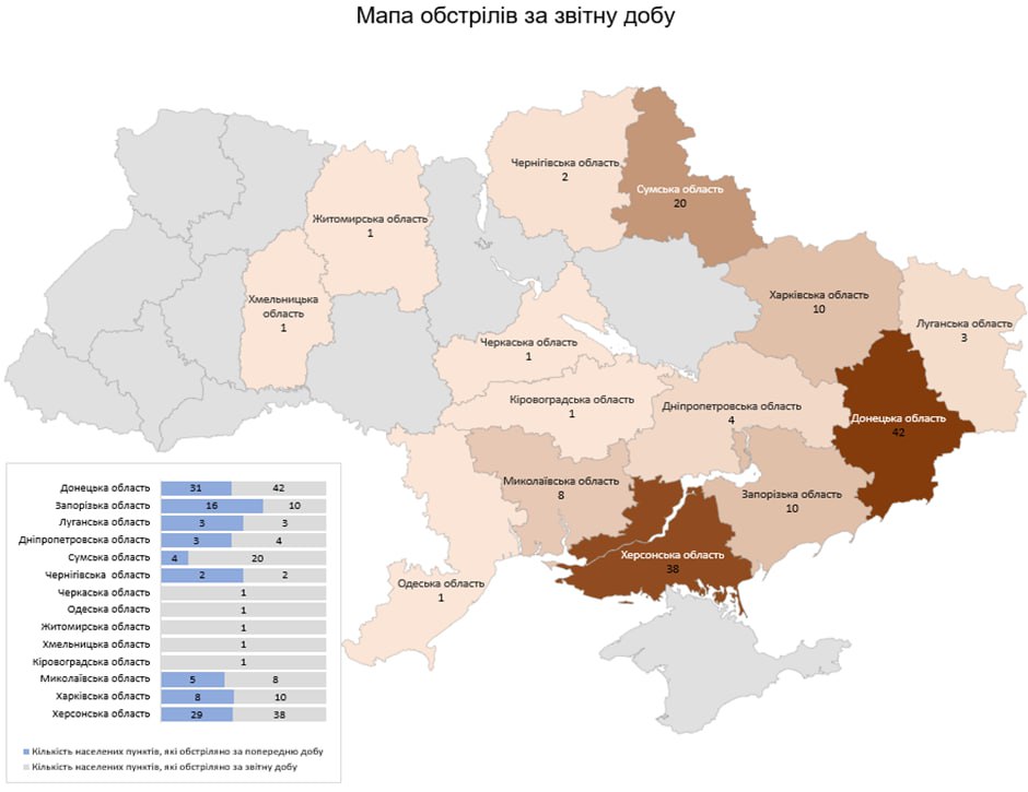 «Загалом із різних видів озброєння — гранатомети, міномети, танки, артилерія, реактивні системи залпового вогню (РСЗВ), безпілотні літальні апарати (БПЛА) та тактична авіація — були атаковані 142 населені пункти та 46 об’єктів інфраструктури», — йдеться у повідомленні.