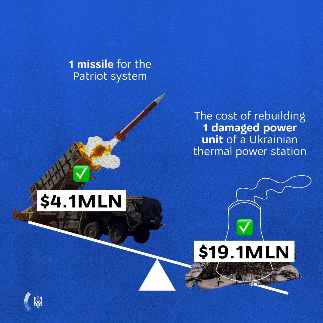 «Проста математика підтримки України. 1 ракета Patriot = 4,1 мільйона доларів. 1 пошкоджений енергоблок = $19,1 млн. Тому є доцільним сьогодні максимально посилити протиповітряну оборону України, щоб потім економити ресурси. Врятовані ППО людські життя безцінні», — написав він.