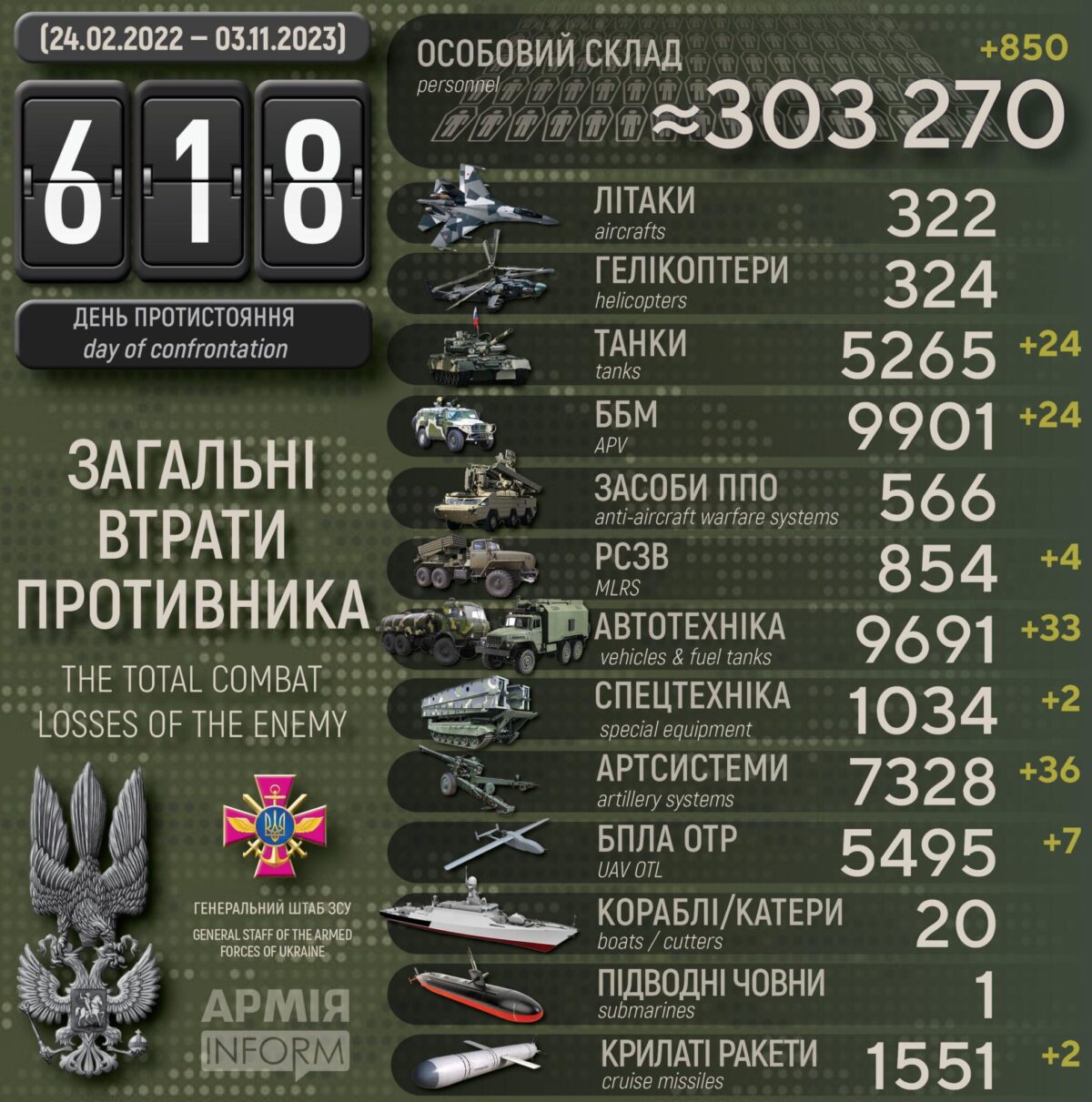 Загальні бойові втрати противника з 24.02.22 по 03.11.23 орієнтовно становлять: