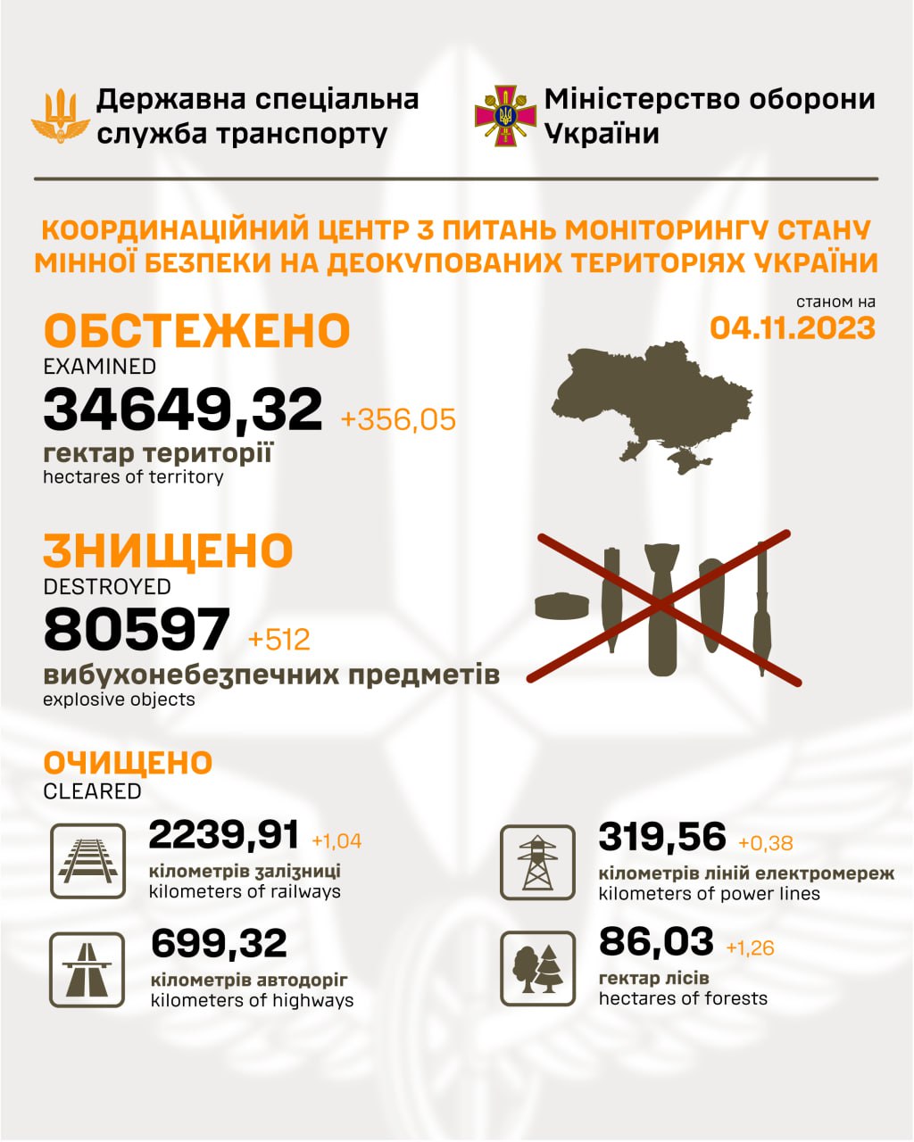 «Координаційний центр з питань моніторингу стану мінної безпеки на деокупованих територіях України інформує, що станом на 4.11.2023 саперні підрозділи Державної спеціальної служби транспорту обстежили 34649,32 (+356,05) га, знищили 80597 (+512) вибухонебезпечних предметів».