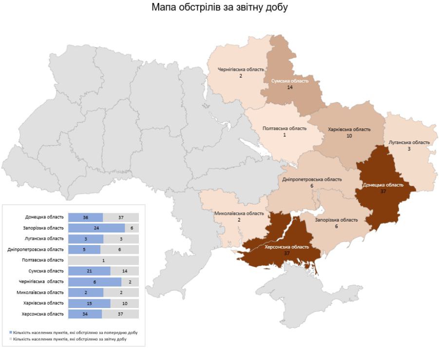 За наданою Ситуаційним центром Міністерства оборони України інформацією, ворог відкривав вогонь з різних видів озброєння — мінометів, танків, ствольної артилерії, РСЗВ, ЗРК, ОТРК, БПЛА та бортового озброєння літаків тактичної авіації. Було атаковано 118 населених пунктів та 120 об’єктів інфраструктури.