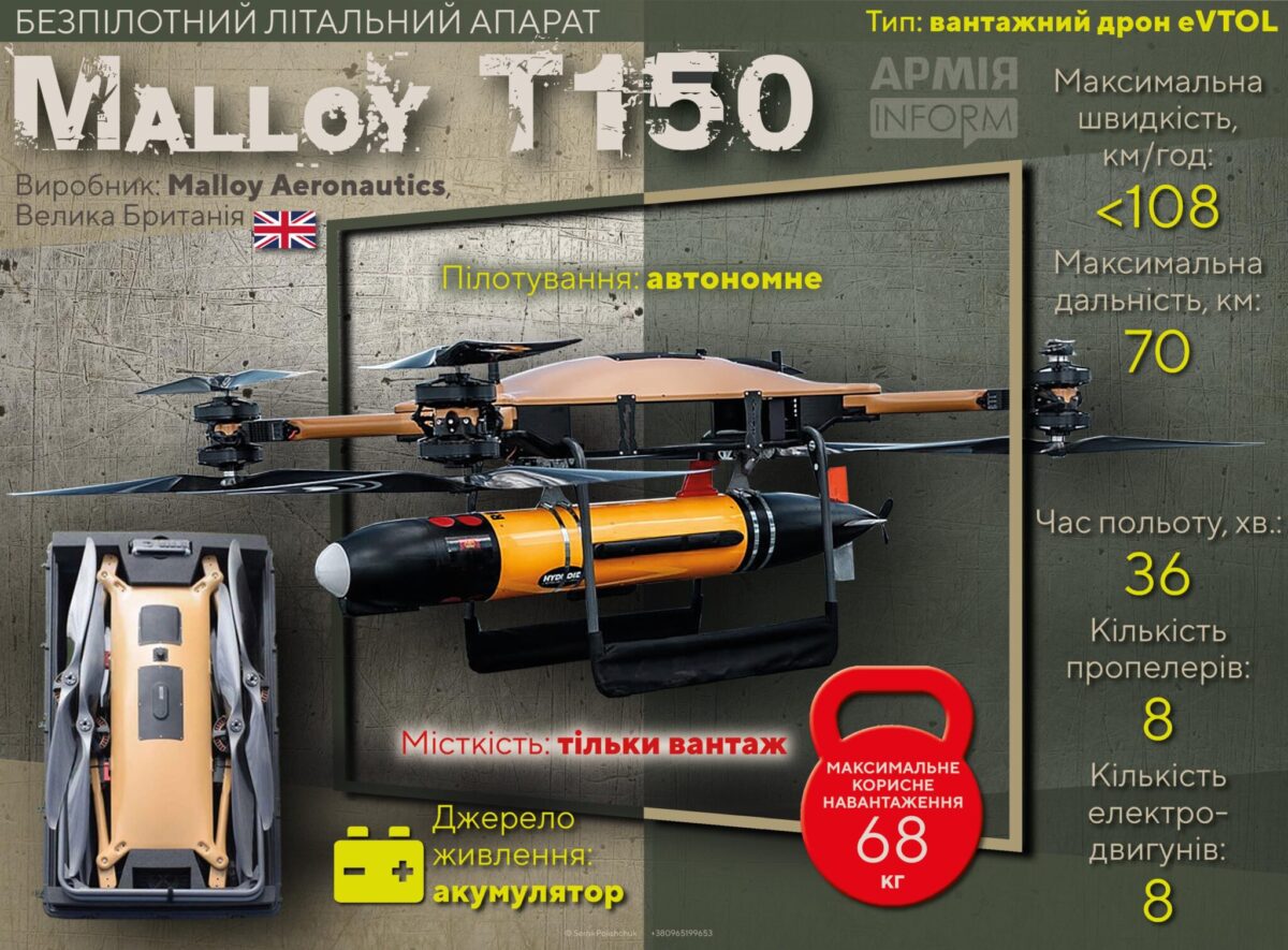 — Malloy T400 — це БПЛА подвійного призначення, який підходить як для цивільних, так і для військових цілей, але компанія рекламує його переважно як військовий безпілотник. Крім того, що він може піднімати до 180 кг вантажу, він має високий рівень автоматизації: може автоматично злітати та приземлятися, подорожувати за запрограмованими маршрутними точками в складних погодних умовах тощо, — про таке в коментарі кореспондентові АрміяInform розповів військовий експерт і директор інформаційно-консалтингової компанії Defense Express Сергій Згурець.