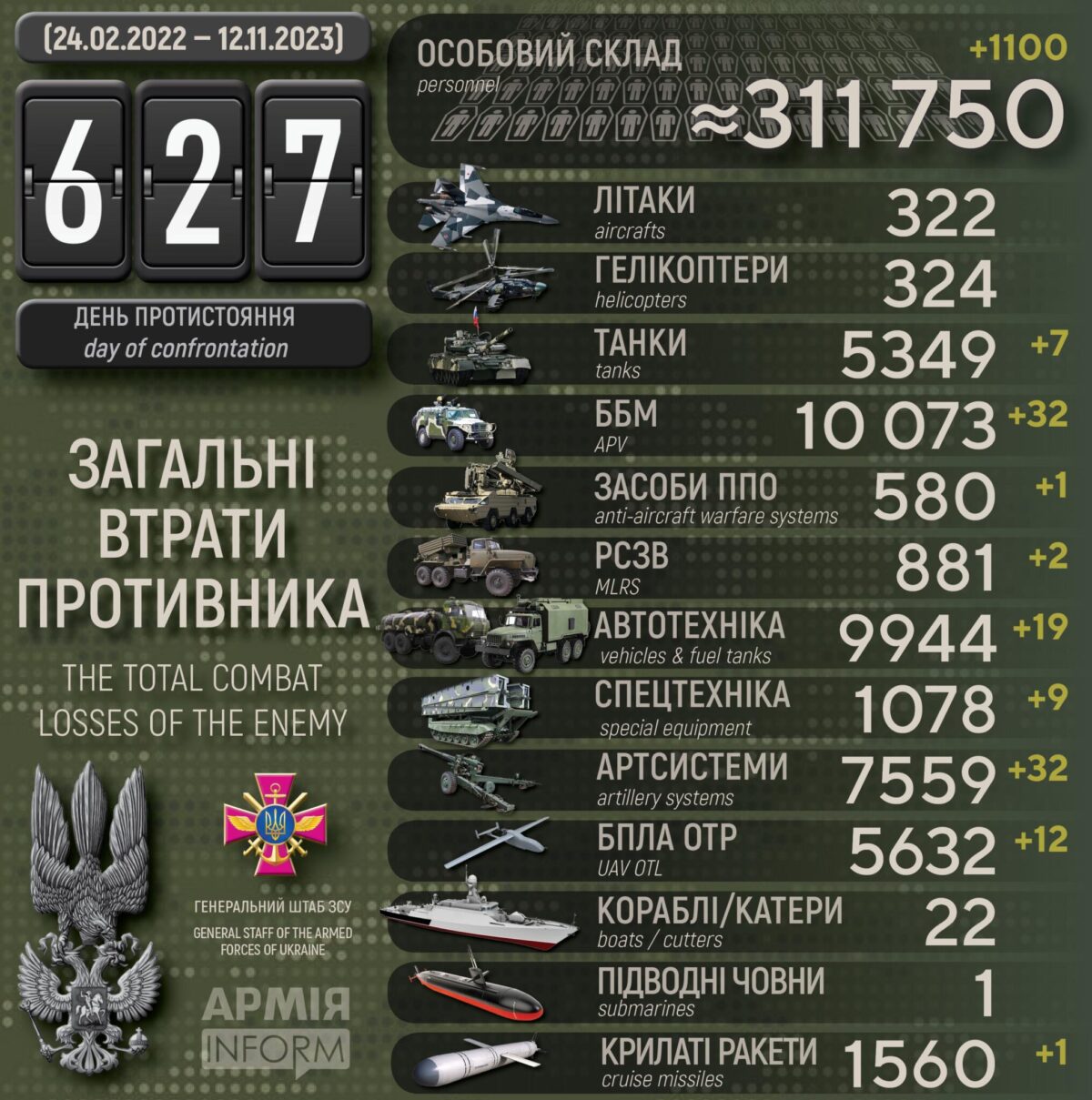Загальні бойові втрати противника з 24.02.22 по 12.11.23 орієнтовно становлять: