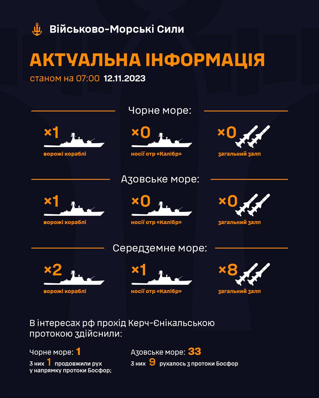 «В Азовському морі 1 ворожий корабель, а в Середземному морі 2 ворожі кораблі, серед яких 1 носій крилатих ракет «калібр», загальний залп до 8 ракет», — йдеться в повідомленні.