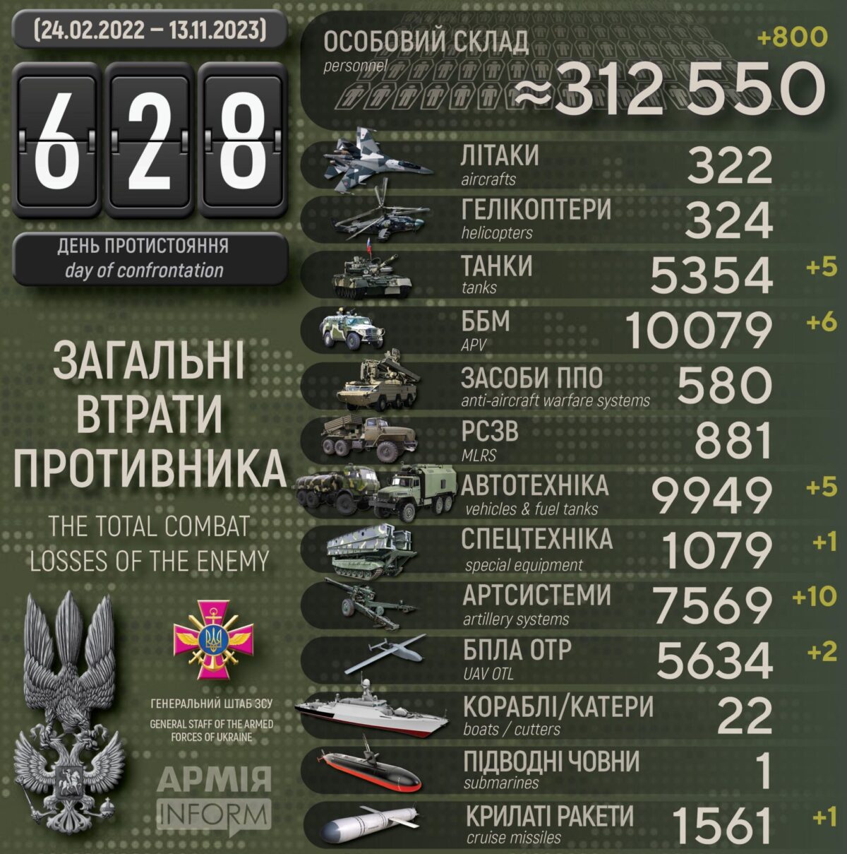 Загальні бойові втрати противника з 24.02.22 по 13.11.23 орієнтовно становлять: