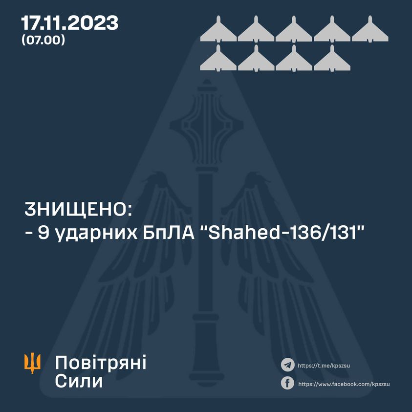 «В результаті бойової роботи дев’ять ворожих ударних БПЛА знищено в межах Миколаївської, Одеської, Житомирської та Хмельницької областей.