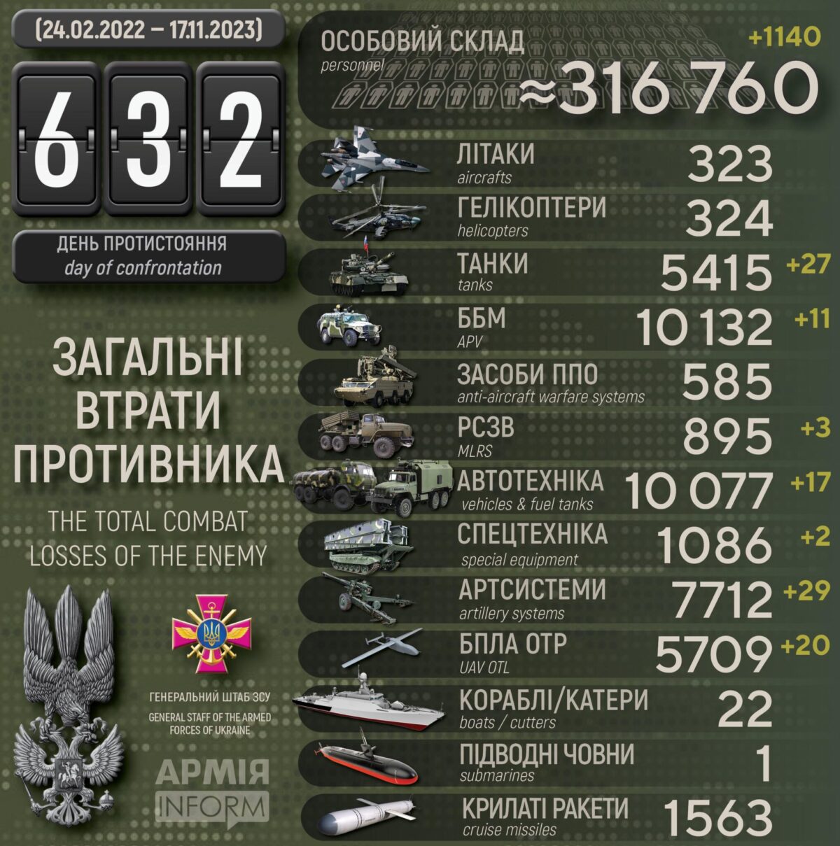 Джерело: Генеральний штаб Збройних Сил України станом на 17.11.23.