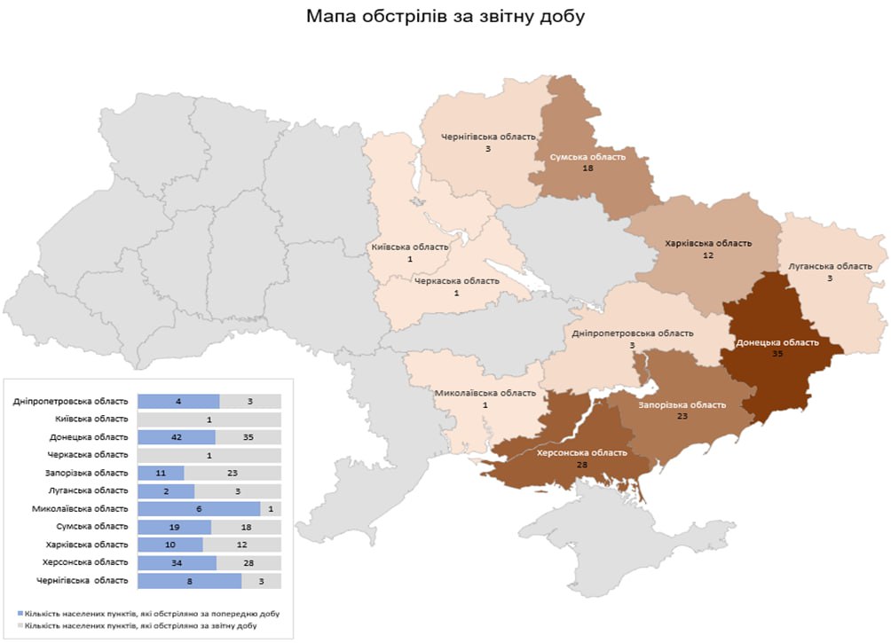 Загалом з різних видів озброєння — гранатомети, міномети, танки, артилерія, РСЗВ, ЗРК, ОТРК, ударні БПЛА та тактична авіація — були атаковані 128 населених пунктів та 89 об’єктів інфраструктури.