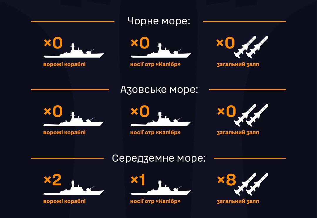 У Середземному морі 2 ворожі кораблі, серед яких 1 носій крилатих ракет «калібр», загальний залп до 8 ракет.