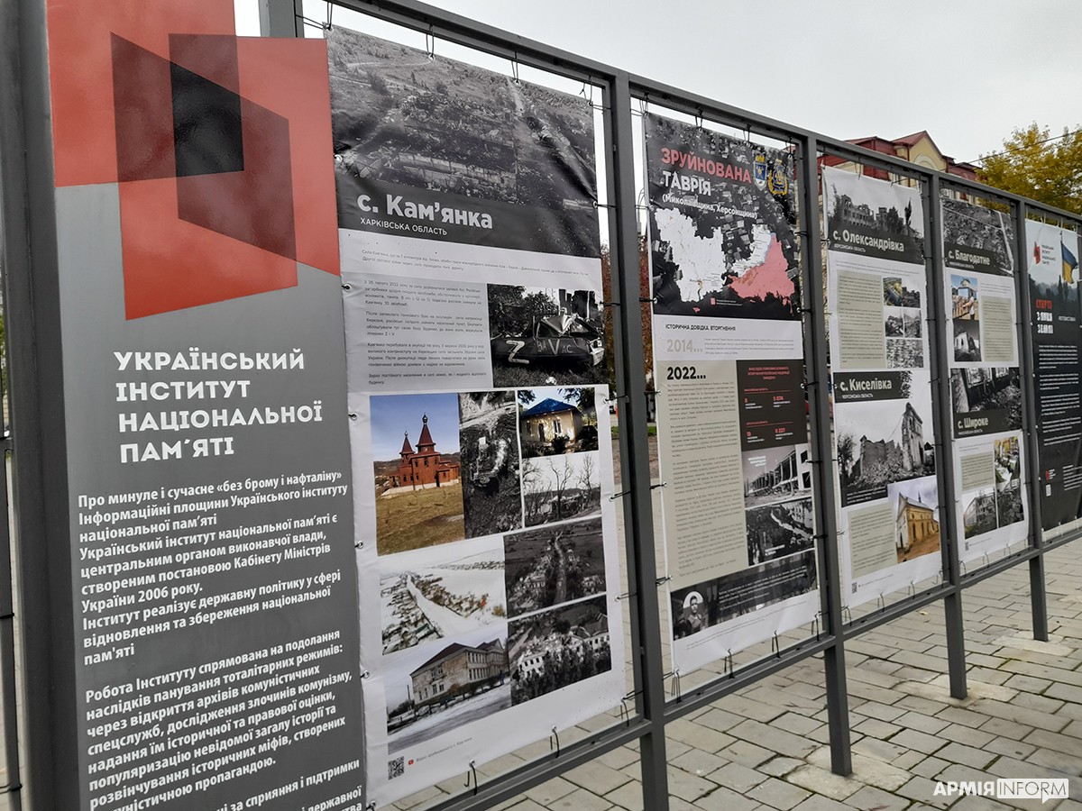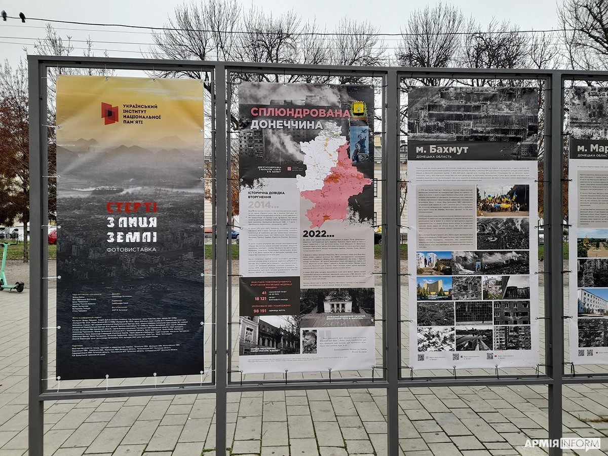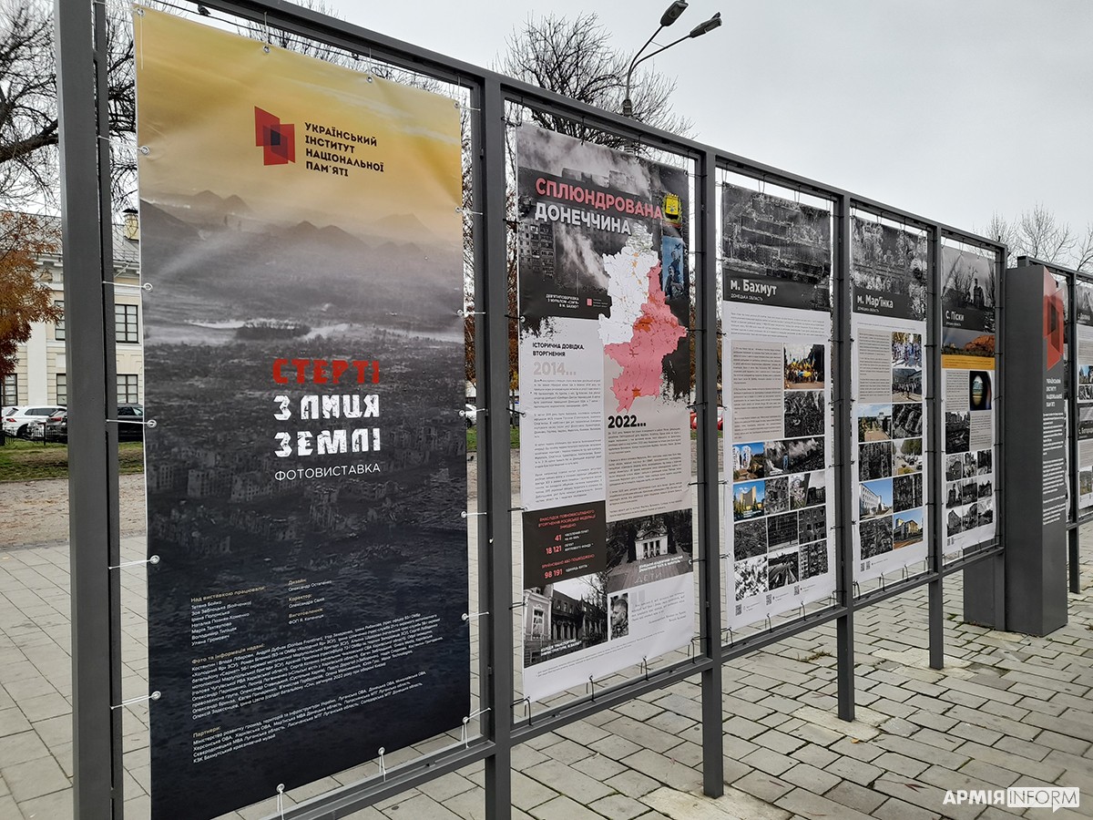 Вулична фотовиставка «Стерті з лиця землі» триває на Контрактовій площі у Києві. На 20 банерах зафіксовано трагедію десятків сіл та міст Донецької, Луганської, Харківської, Миколаївської та Херсонської областей, практично повністю знищених російськими окупантами. Організував виставку Український інститут національної пам’яті (УІНП) за співпраці з Міністерством розвитку громад, територій та інфраструктури України й обласними військовими адміністраціями.
