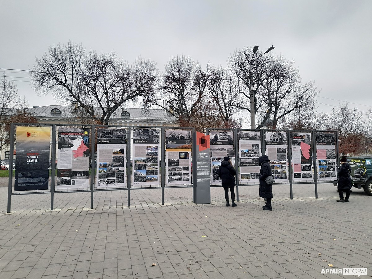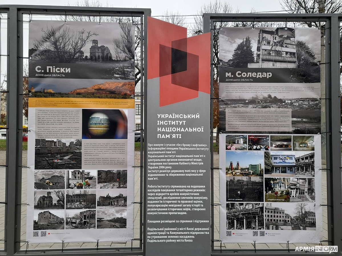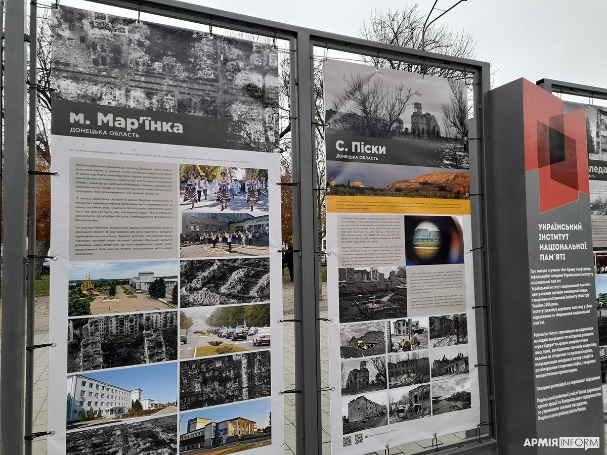Вулична фотовиставка «Стерті з лиця землі» триває на Контрактовій площі у Києві. На 20 банерах зафіксовано трагедію десятків сіл та міст Донецької, Луганської, Харківської, Миколаївської та Херсонської областей, практично повністю знищених російськими окупантами. Організував виставку Український інститут національної пам’яті (УІНП) за співпраці з Міністерством розвитку громад, територій та інфраструктури України й обласними військовими адміністраціями.