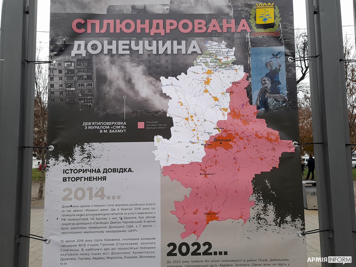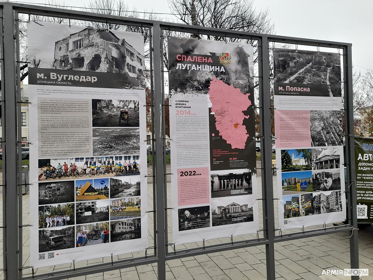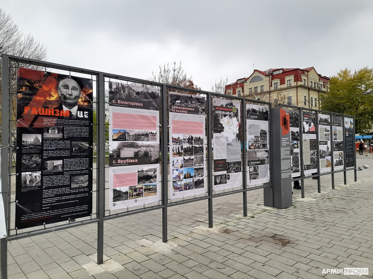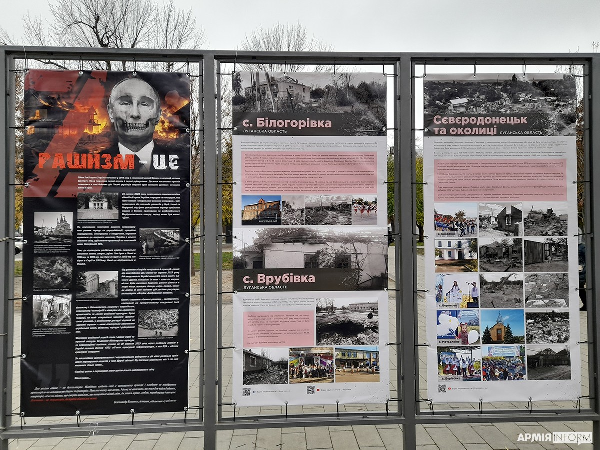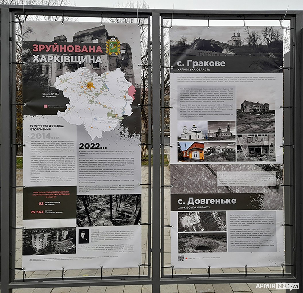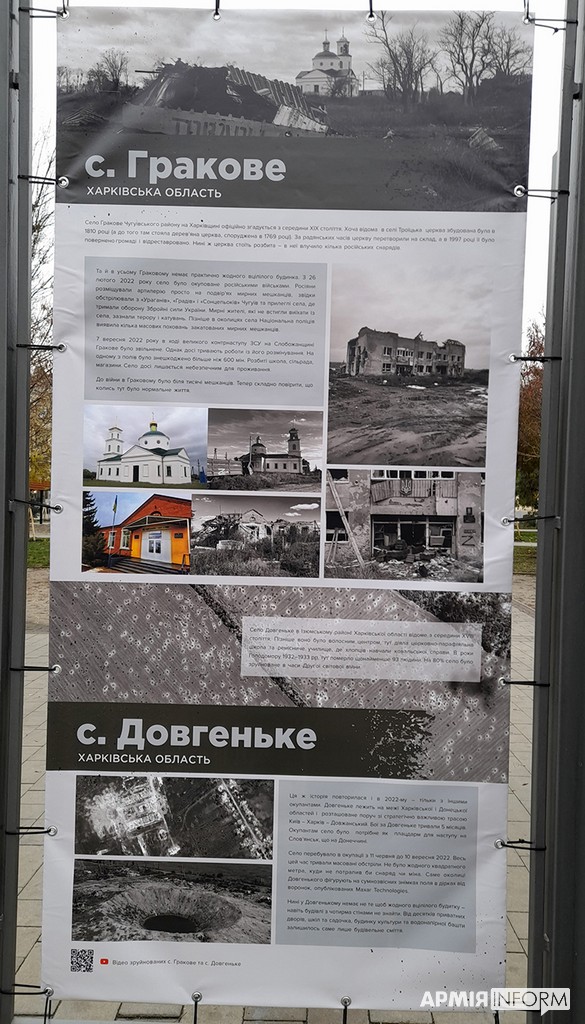 — Так, на одному з банерів наведено слова військовослужбовця Олександра Хоменка, який бачив це в боях під Зайцевим. Він сказав, що для росіян війна — це бухгалтерія, коли вони сидять у бункері і просто квартал за кварталом, квадрат за квадратом вогнем зачищають села і перетворюють їх на купу каміння. Для загарбників це просто територія, яку треба знищити, а для людей, які там жили — це їхні долі, це їхня історія, це їхній світ, який руйнується просто у них на очах.