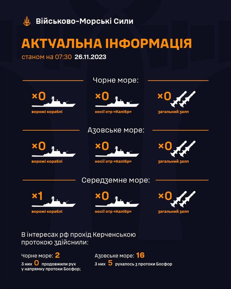 «Станом на 07:30 26.11.2023 у Чорному та Азовському морях ворожі кораблі відсутні, в Середземному морі 1 ворожий корабель», — йдеться в повідомленні.
