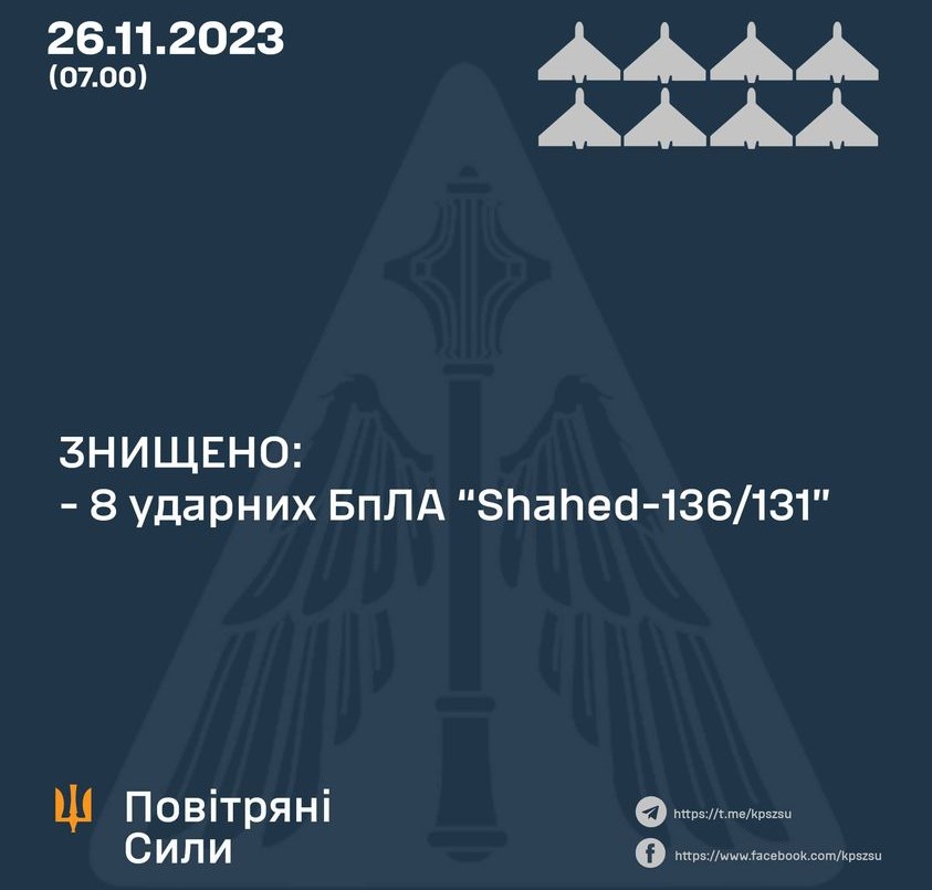 У ніч на 26 листопада 2023 року окупанти атакували з південно-східного напрямку (Приморсько-Ахтарськ, рф) 9-ма ударними БПЛА типу Shahed..