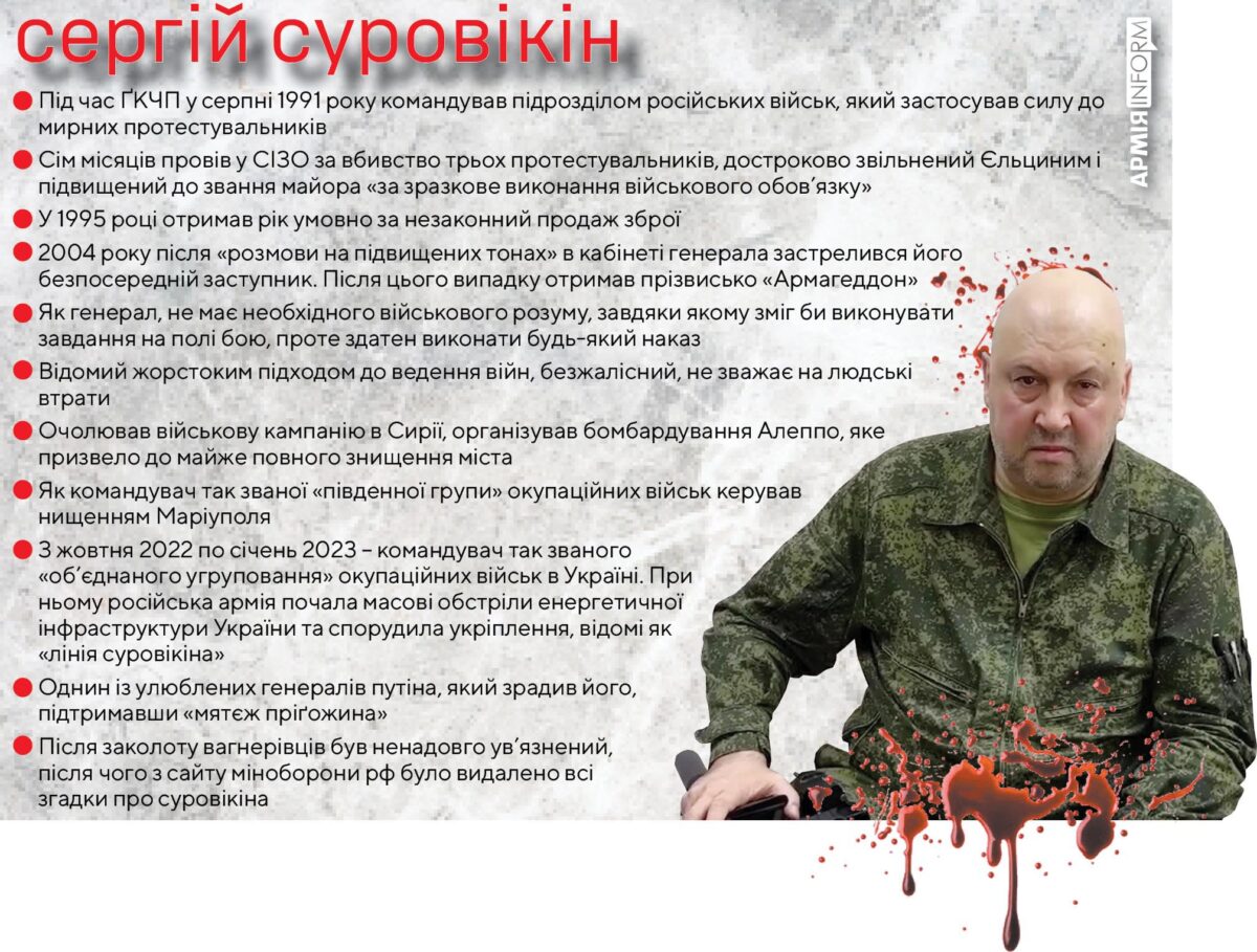 Тож коли в червні 2023 року під час заколоту прігожина суровікін звернувся до вагнерівців, закликавши їх «зупинитися», його заарештували. А звільнивши з-під варти у вересні — видалили всі згадки про нього із сайту міноборони рф.