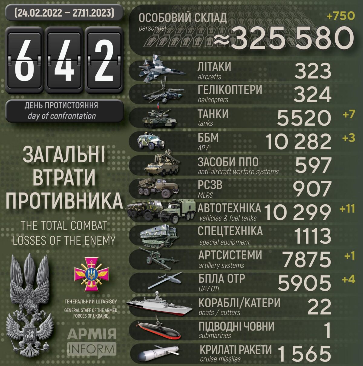 Джерело: Генеральний штаб Збройних Сил України станом на 27.11.23.