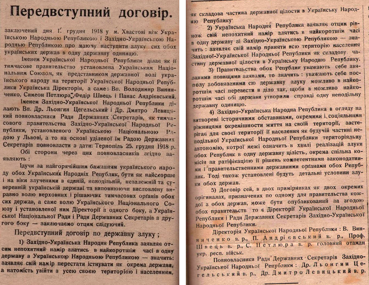 Передвступний договір підписали уповноважені особи Директорії УНР Симон Петлюра, Володимир Винниченко, Панас Андрієвський та Федір Швець з одного боку й урядові делегати Ради державних секретарів ЗУНР Дмитро Левицький і Лонгин Цегельський з другого. Згідно з умовами документа, найближчим часом ЗУНР мала припинити існувати як окрема держава та увійти до складу УНР на засадах автономії.