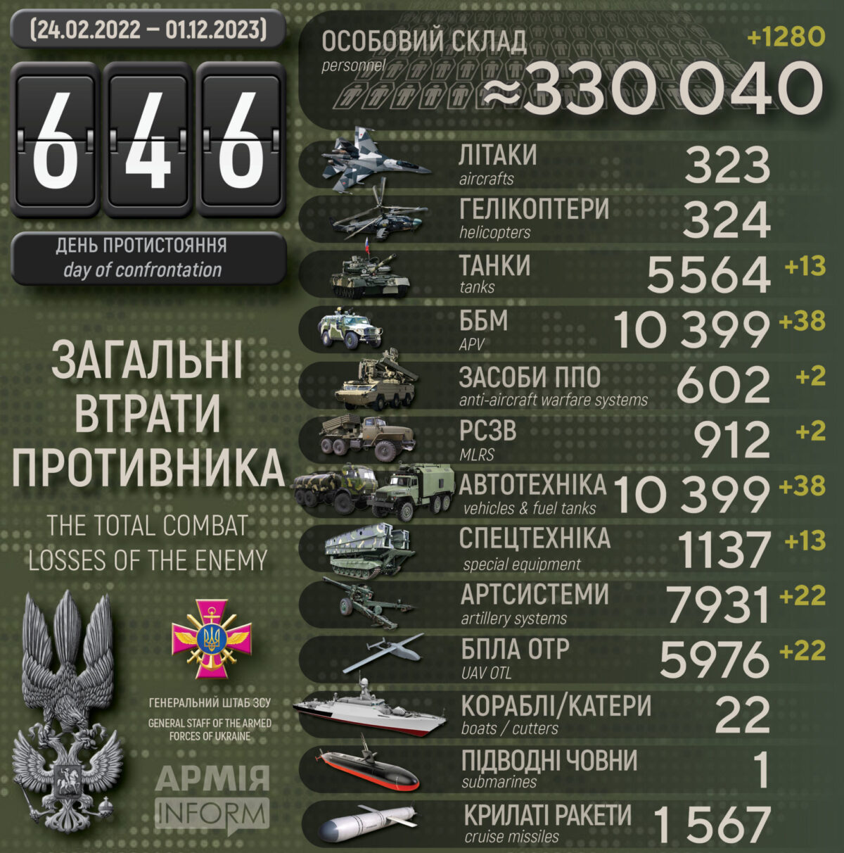Джерело: Генеральний штаб Збройних Сил України станом на 01.12.23.
