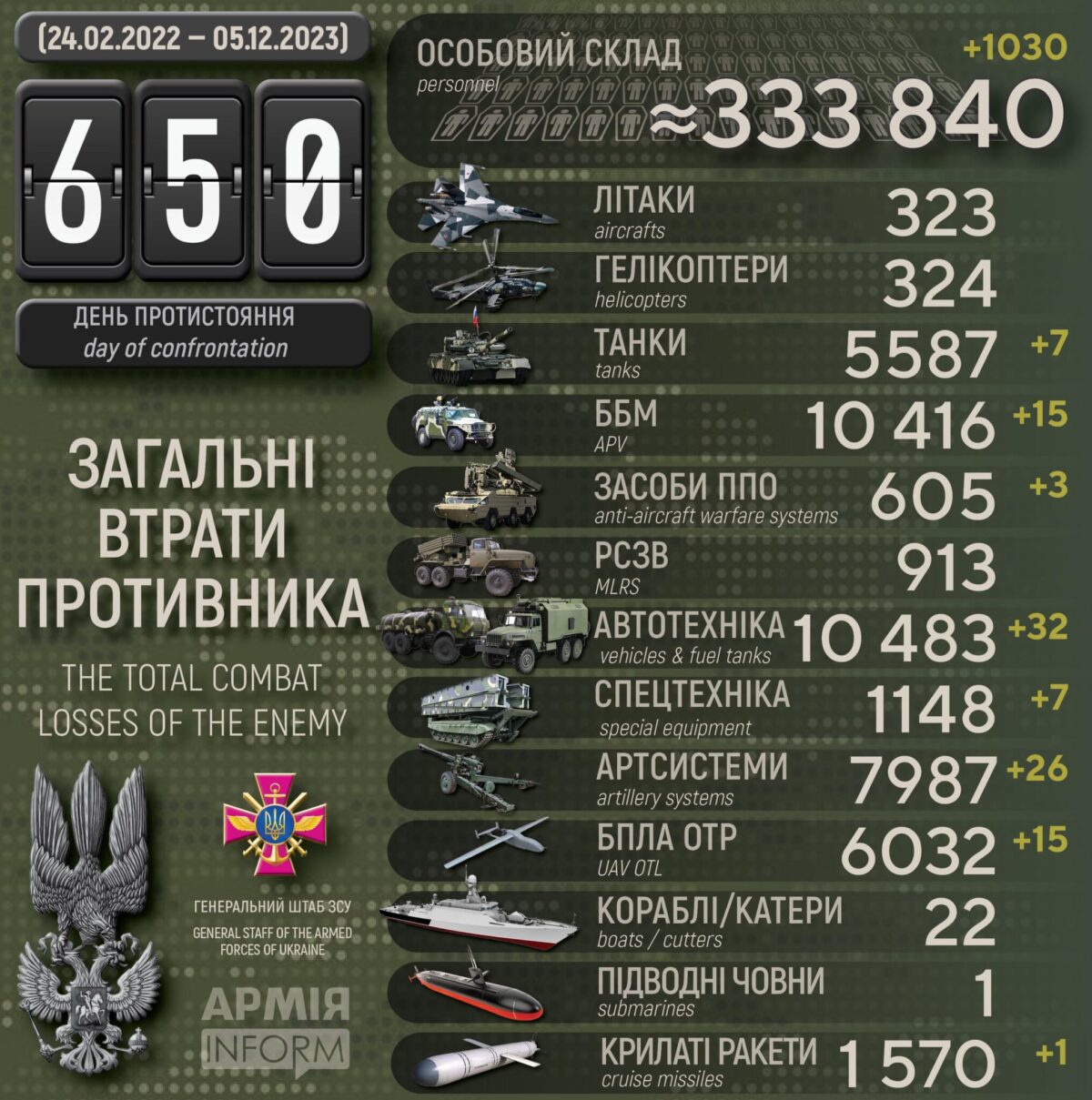 Загальні бойові втрати противника з 24.02.22 по 05.12.23 орієнтовно становлять: