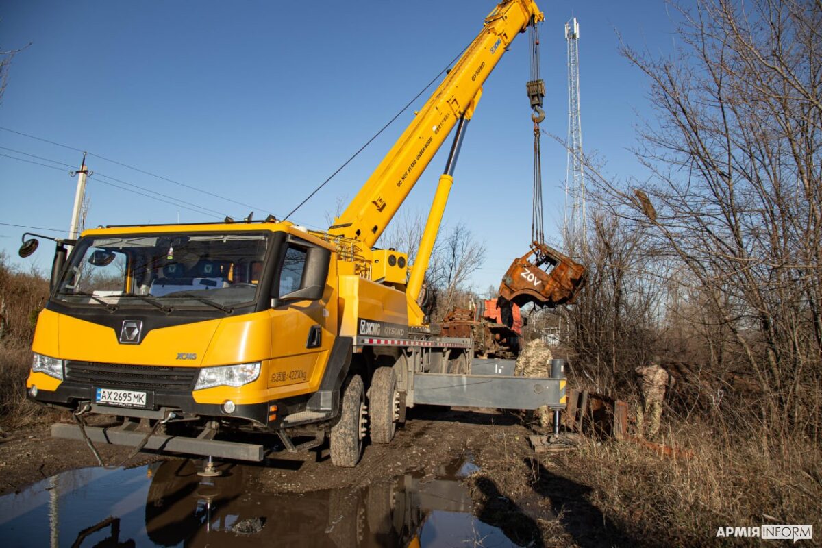 … Уже понад пів години оператор крана-маніпулятора Олександр, який на волонтерських засадах допомагає українським військовим, намагається зрушити з місця те, що залишилося від російського танка Т-72. Навіть без башти це залізяччя важить близько 20 тонн, а за рік воно ще й добряче загрузнуло у багнюці та місцями прогнило до дірок, що сильно ускладнює процес завантаження.