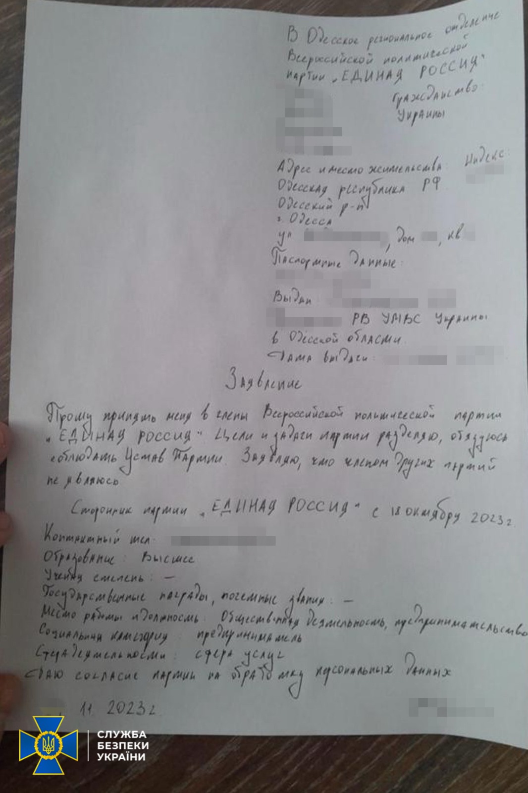 Передачу отриманих відомостей він здійснював через популярний месенджер, а щоб максимально замаскувати «сеанси» зв’язку, використовував різні телефонні номери та акаунти. Згодом ворожий агент написав заяву на вступ до кремлівської партії «єдина росія» і у разі захоплення регіону сподівався увійти до керівної ланки окупаційної адміністрації рф.