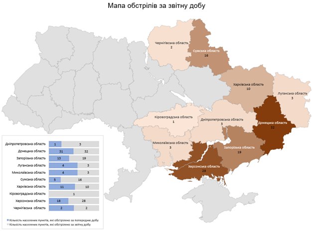 Загалом з різних видів озброєння — гранатомети, міномети, танки, артилерія, РСЗВ, БПЛА, ЗРК, тактична авіація — були атаковані 117 населених пунктів та 40 об’єктів інфраструктури.