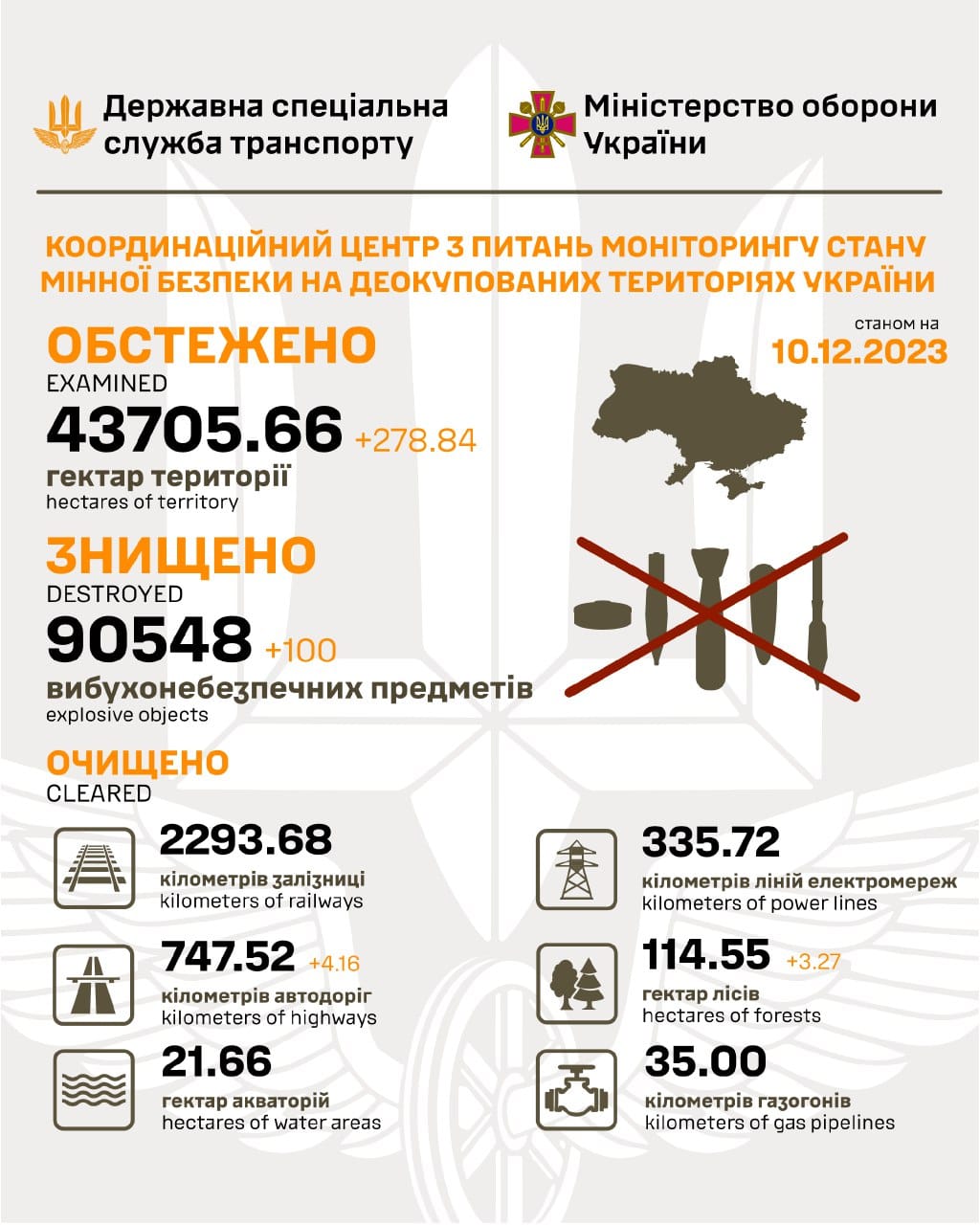 Станом на 10.12.2023 саперні підрозділи Державної спеціальної служби транспорту обстежили майже 280 га території та знешкодили 100 вибухонебезпечних предметів.