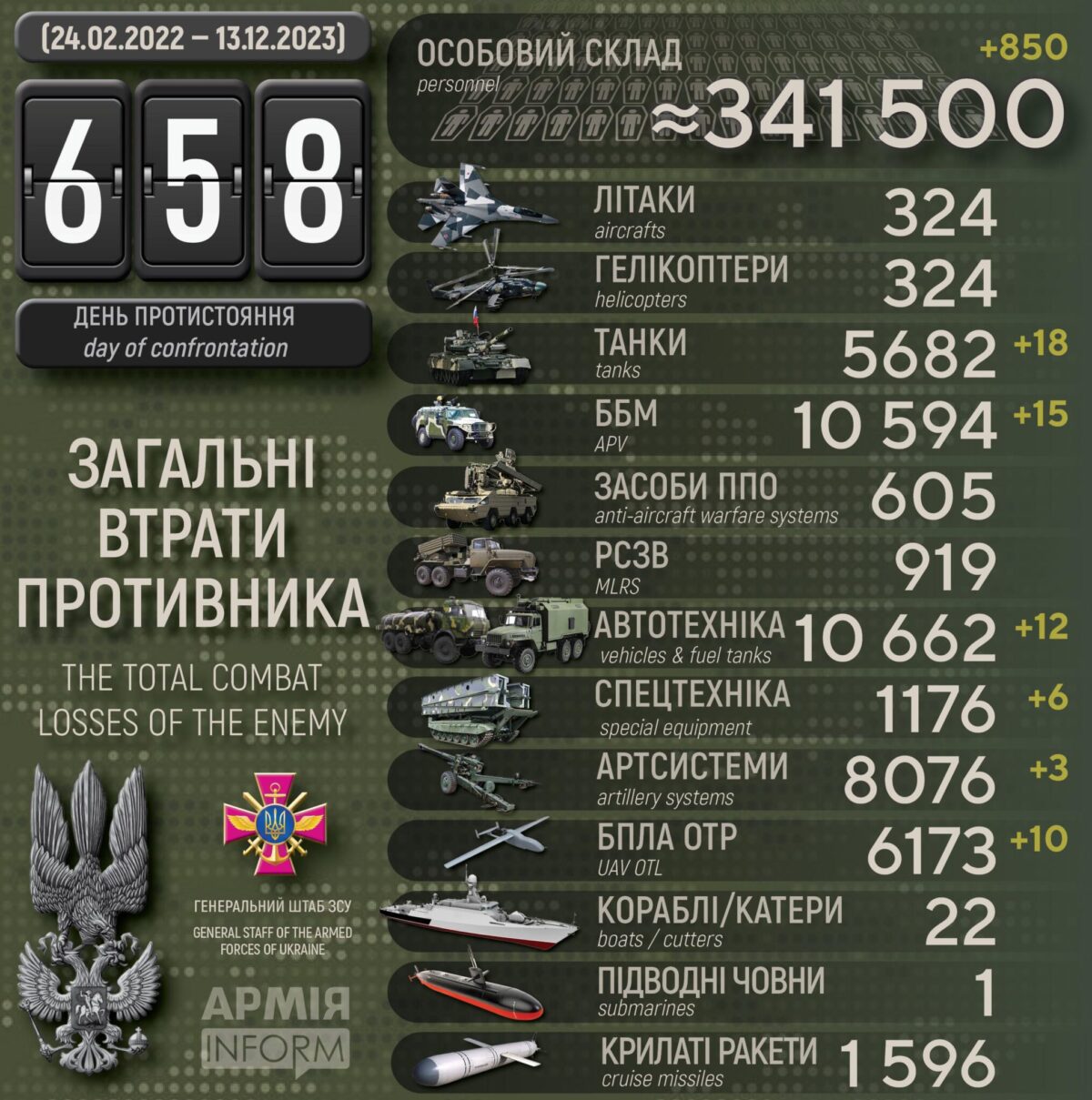 Джерело: Генеральний штаб Збройних Сил України станом на 13.12.23.
