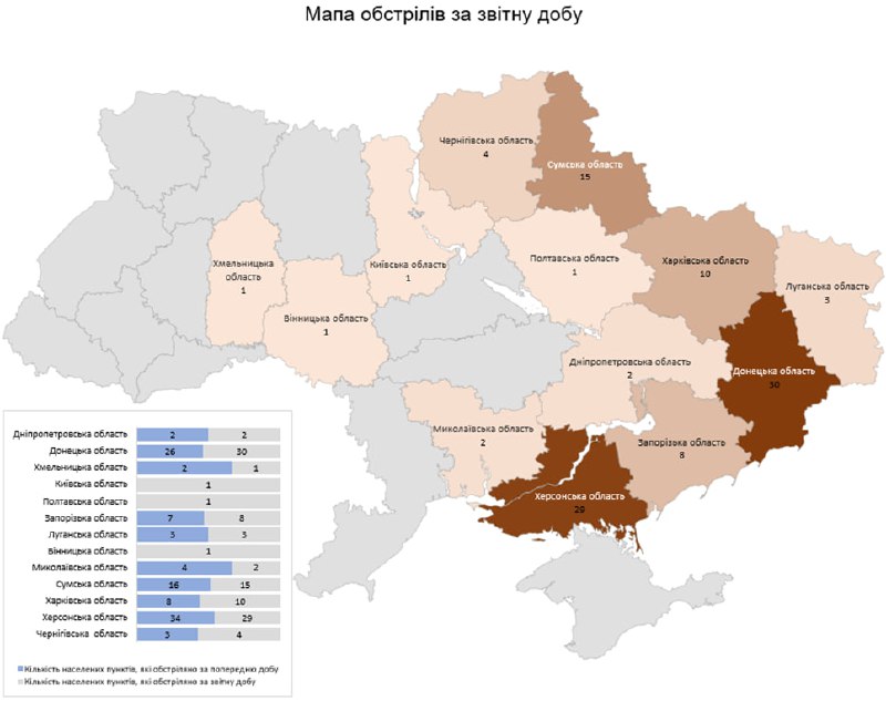 Загалом з різних видів озброєння — міномети, танки, артилерія, РСЗВ, БПЛА, ЗРК, тактична авіація — були атаковані 107 населених пунктів та 30 об’єктів інфраструктури.