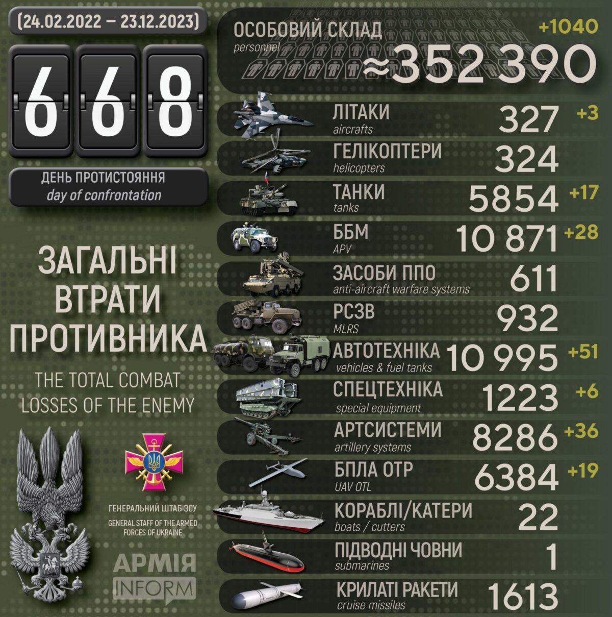 Джерело: Генеральний штаб Збройних Сил України станом на 23.12.23.