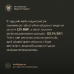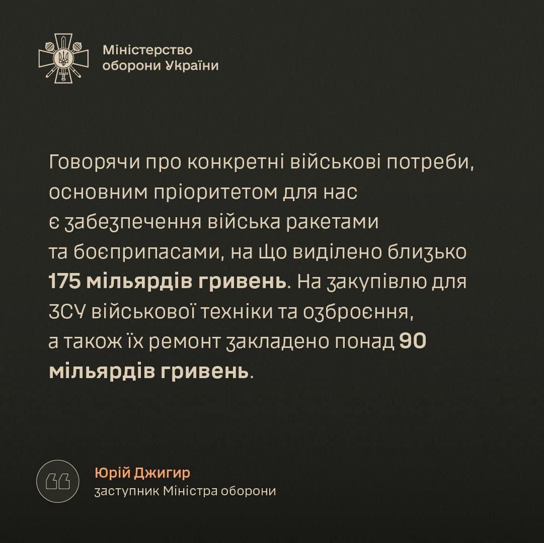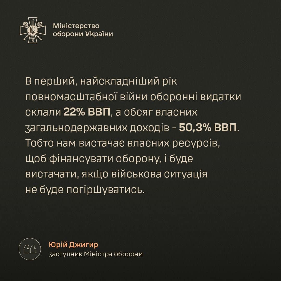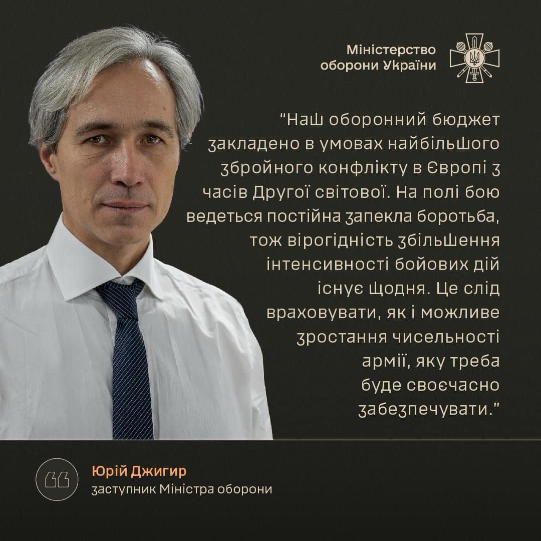 «Наш оборонний бюджет закладено в умовах найбільшого збройного конфлікту в Європі з часів Другої світової. На полі бою ведеться постійна запекла боротьба, тож вірогідність збільшення інтенсивності бойових дій існує щодня. Це слід враховувати, як і можливе зростання чисельності армії, яку треба буде своєчасно забезпечувати», — додав заступник міністра.
