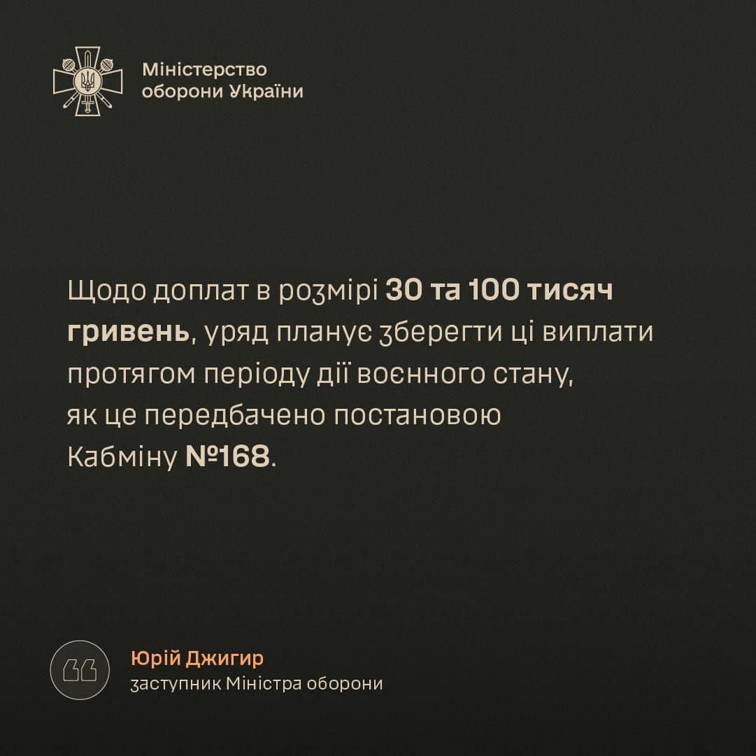 «На виплати військовослужбовцям у 2024 році виділять 751,3 мільярда гривень. Щодо доплат у розмірі 30 та 100 тисяч гривень, уряд планує зберегти ці виплати протягом періоду дії воєнного стану, як це передбачено постановою Кабміну № 168», — пояснив заступник міністра.