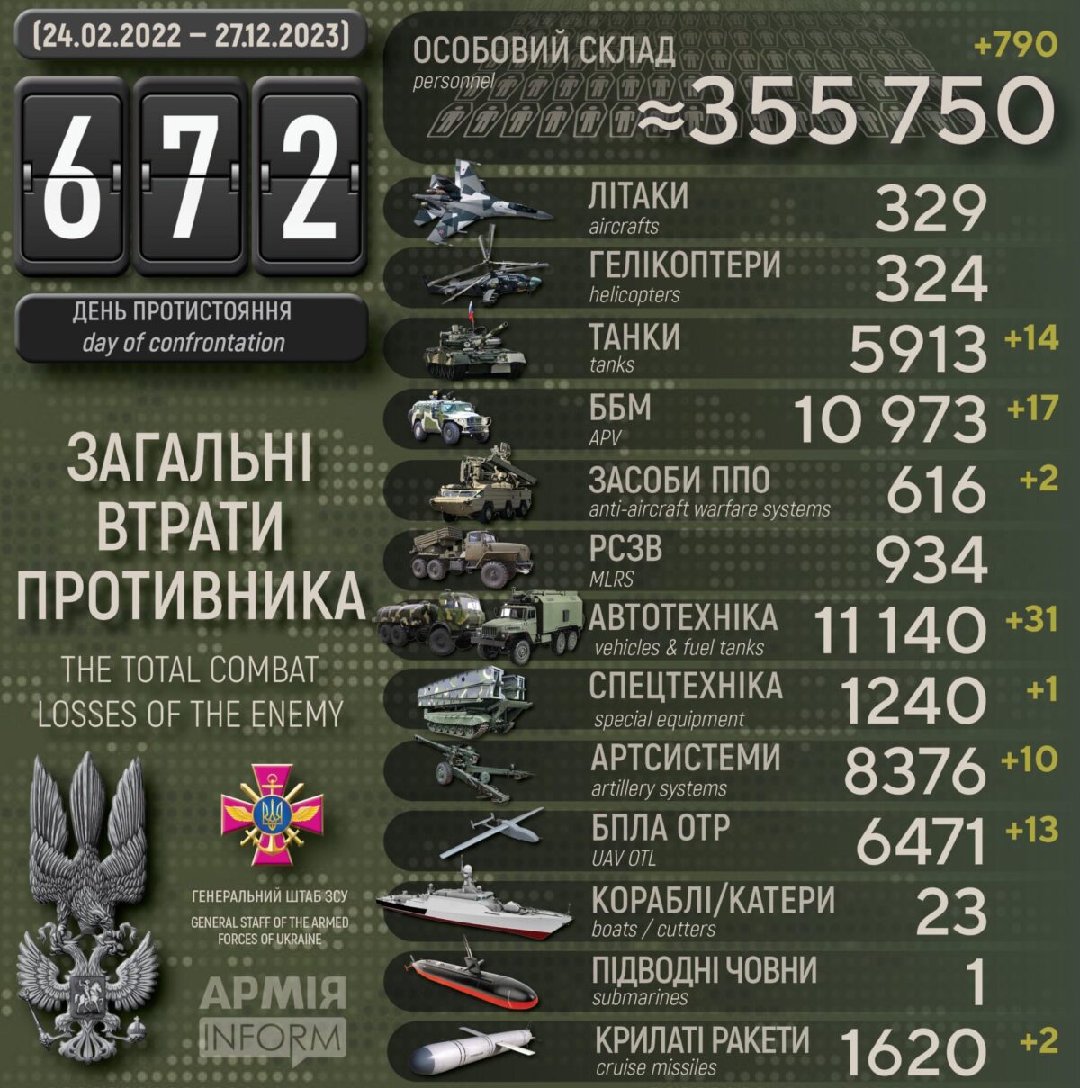 Загальні бойові втрати противника з 24.02.22 по 27.12.23 орієнтовно становлять: