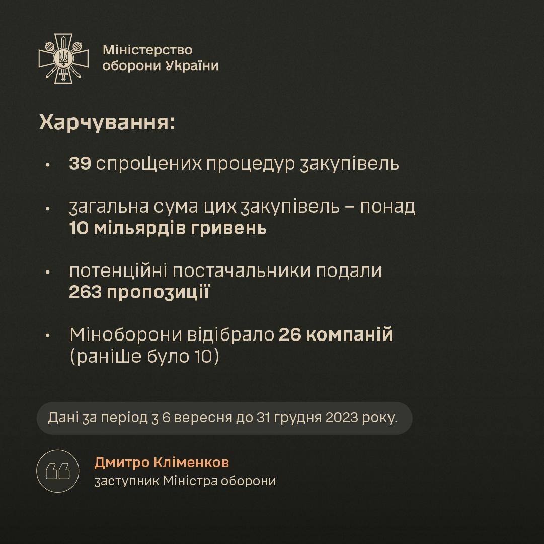 Харчування. Загалом за вказаний період Міноборони провело 39 закупівель за спрощеною процедурою на суму понад 10 мільярдів гривень. Потенційні постачальники подали 263 пропозиції. Міноборони відібрало 26 компаній (раніше було 10). Завдяки конкуренції зменшилась вартість харчування військовослужбовців. Результат — на перший квартал 2024 року усі військові забезпечені харчуванням, водою та посудом.