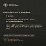Пально-мастильні матеріали. За аналогічний період Міноборони уклало 51 договір на суму понад 5,5 мільярда гривень. Це 93,5 тисячі тонн пально-мастильних матеріалів, зокрема 18 мастил за стандартами НАТО. Все отримано в повному обсязі.
