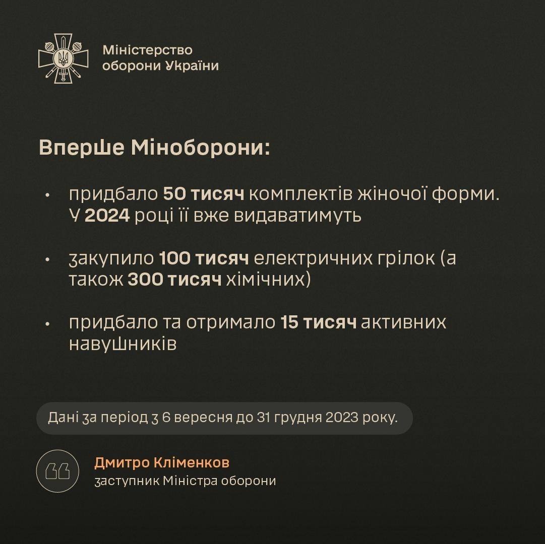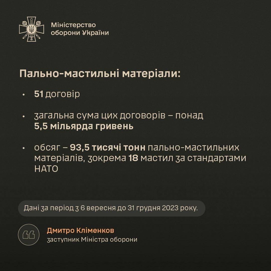Загалом у 2023 році для тилового забезпечення Збройних Сил Міністерством оборони було закладено 97 мільярдів гривень. Контракти укладені на усі 100% бюджету.