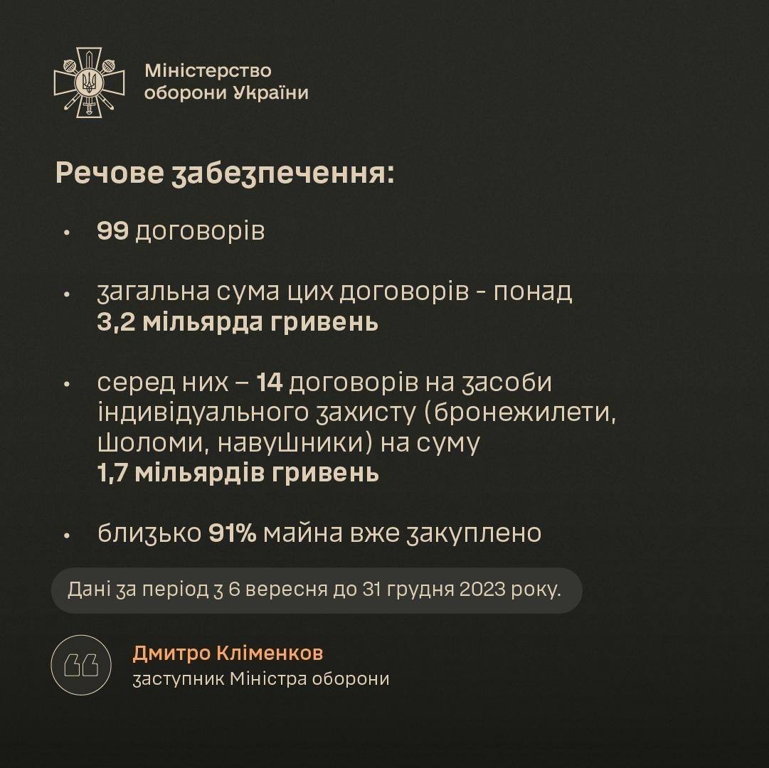 Речове забезпечення. За аналогічний період Міноборони уклало 99 договорів на суму понад 3,2 мільярда гривень (зокрема, 14 договорів на засоби індивідуального захисту — бронежилети, шоломи, навушники) на суму 1,7 мільярда гривень. Близько 91% майна вже закуплено.
