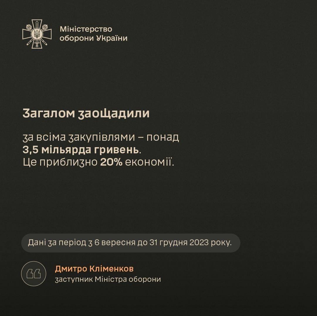 Загальна економія за всіма закупівлями — понад 3,5 мільярда гривень (приблизно 20% від запланованої суми на закупівлі).